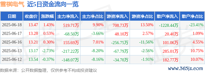 本站消息,截至2025年6月18日收盘,雪祺电气(001387)报收于13.47元国融资管,上涨1.43%,换手率3.43%,成交量3.91万手,成交额5248.39万元。