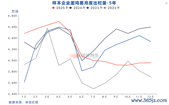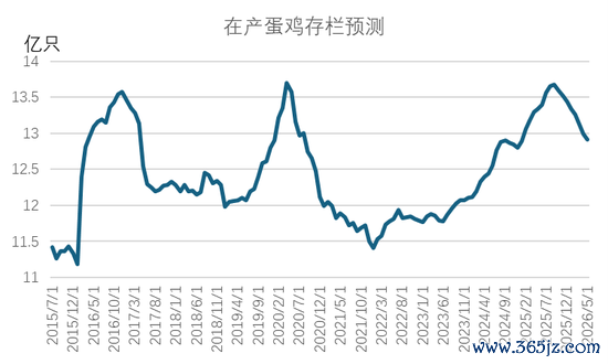 从鸡苗补栏情况来看,2025年7月开始,样本鸡苗补栏量(占实际补栏占比50%)开始同比下滑,且下半年鸡苗补栏同比下滑幅度逐月扩大。数据显示,8-12月鸡苗单月销量同比降幅分别为9.4%、14.1%、12.7%、13.4%及13.9%,基本每个月的同比降幅都在10%左右。我们用鸡苗补栏后5个月开产进行测算,预计2026年1月至2026年5月期间,新开产蛋鸡数量将持续处于低位。2025年下半年行业低迷的补栏将使得2026年上半年蛋鸡新开产压力显著降低。