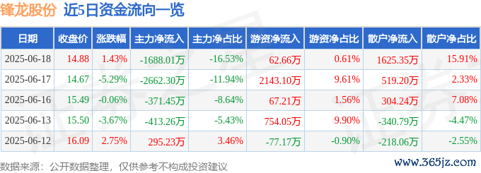 本站消息荣立通,截至2025年6月18日收盘,锋龙股份(002931)报收于14.88元,上涨1.43%,换手率3.48%,成交量6.98万手,成交额1.02亿元。